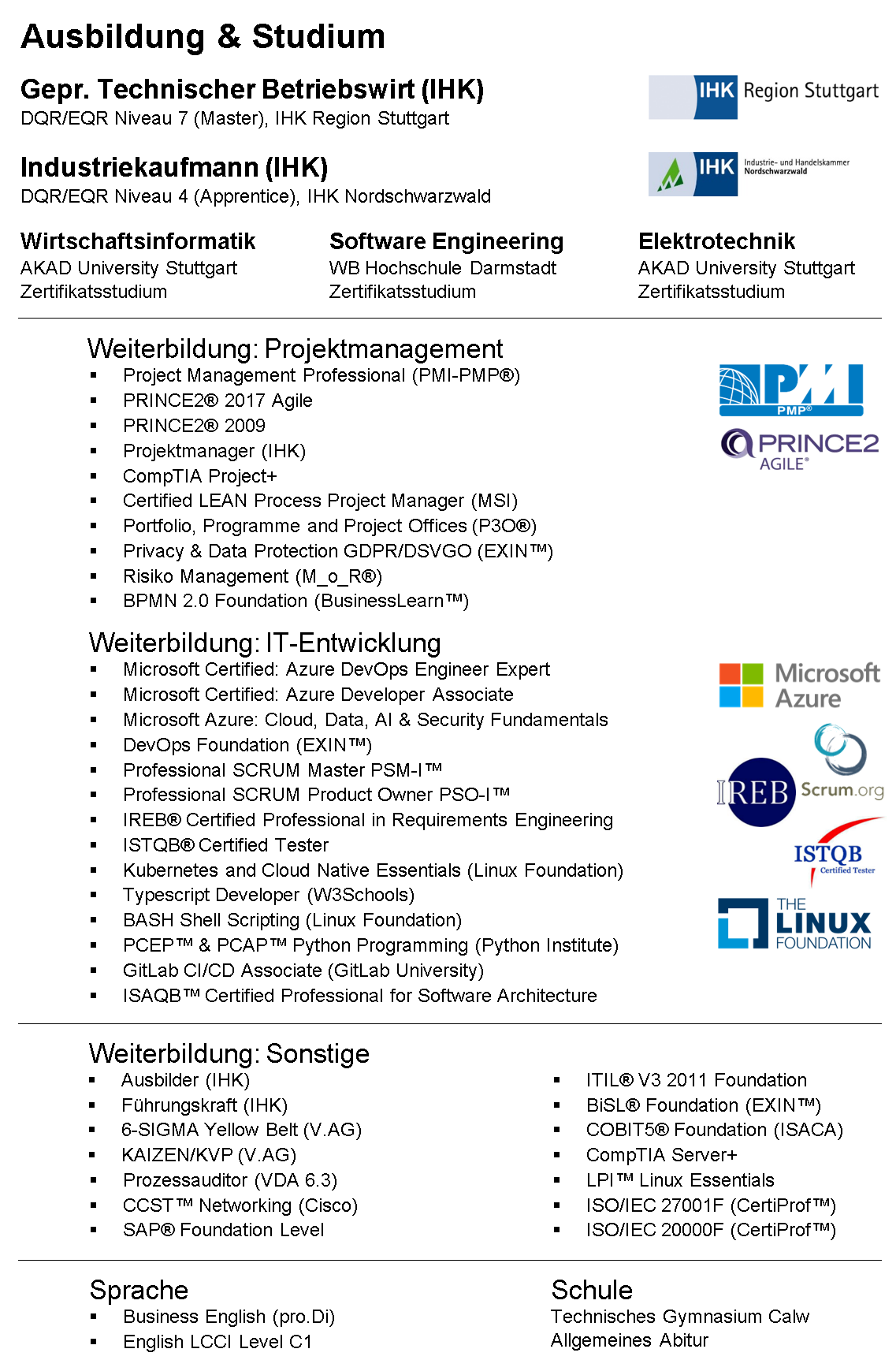 Ich verfüge über eine Bibliothek aus den beiden Feldern BWL: Projektmanagement und MINT: Software- und Hardwareentwicklung und bilde mich in diesen Gebieten weiter um eine noch bessere Leistung liefern zu können.